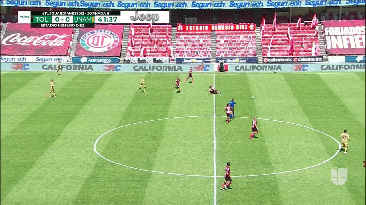 Tiro atajado junto al lado derecho de la portería. Michael Estrada (Toluca) disparo de cabeza desde el centro del área. Asistencia de Raúl López con un centro al área.
