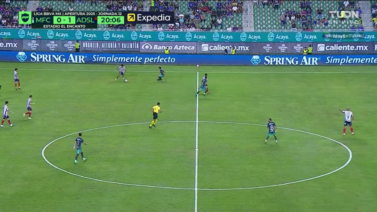 Tiro atajado raso al centro del arco. Miguel García (Atlético San Luis) zurdazo desde el centro del área.
