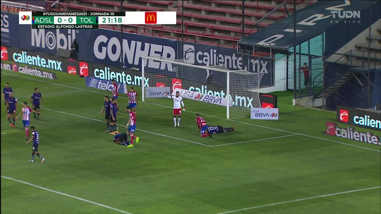 Tiro atajado. Nicolás Ibáñez (Atlético San Luis) disparo de cabeza desde el centro del área.