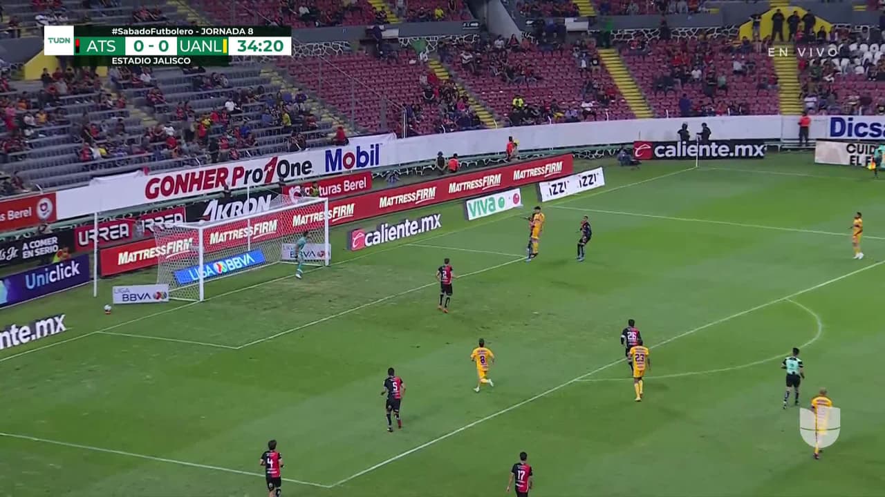 Tiro atajado por abajo a la izquierda. Nicolás Ibáñez (Tigres) disparo de cabeza desde el centro del área. Asistencia de Sebastián Córdova con un centro al área.