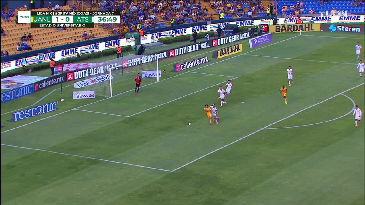 Tiro atajado al ángulo superior derecho. Nicolás López (Tigres) disparo de cabeza desde el centro del área. Asistencia de Aldo Cruz con un centro al área.