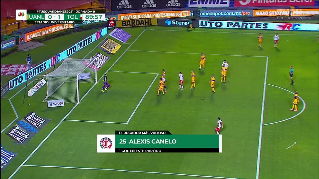 Tiro atajado Por arriba en el centro del arco. Nicolás López (Tigres) zurdazo desde la banda derecha.