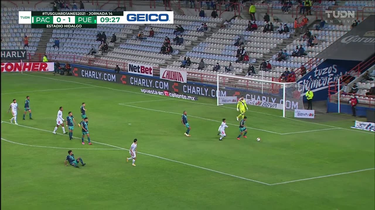 Tiro atajado raso al centro del arco. Omar Fernández (Puebla) Disparo con la derecha desde el lado derecho dentro del área. Asistencia de Christian Tabó.