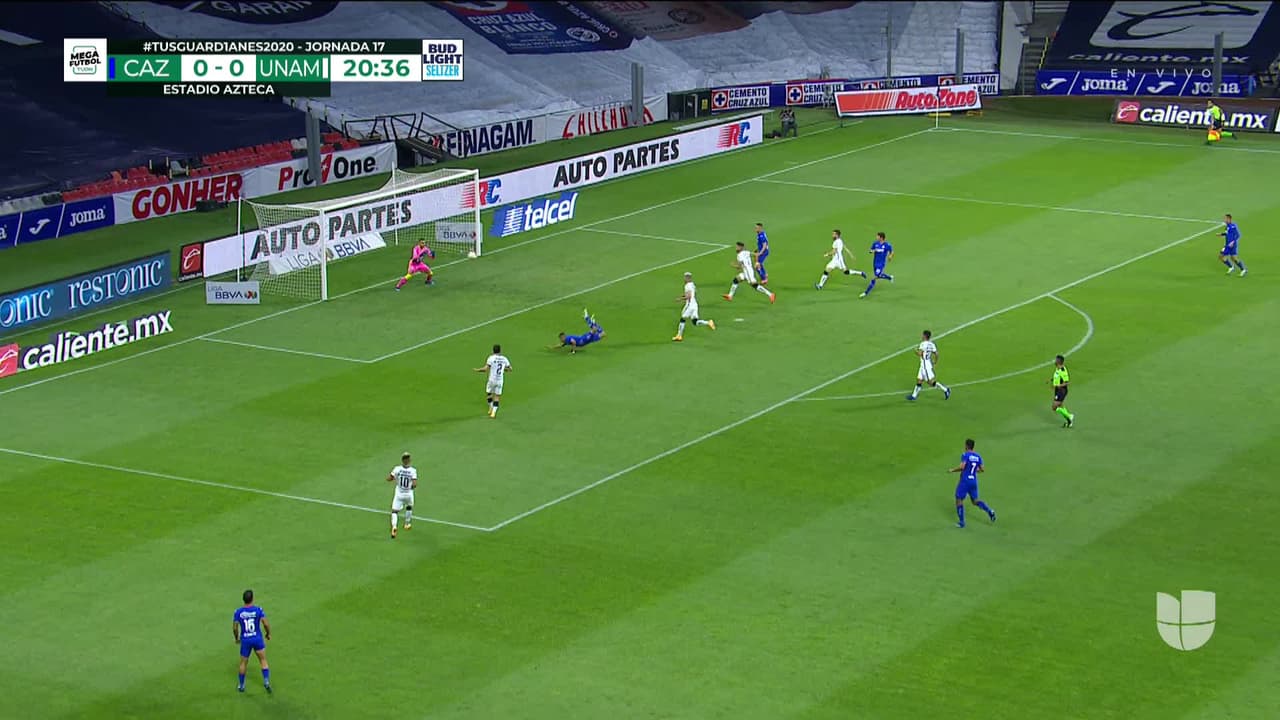 Tiro atajado raso al centro del arco. Orbelín Pineda (Cruz Azul) disparo de cabeza desde el centro del área. Asistencia de Adrián Aldrete con un centro al área.