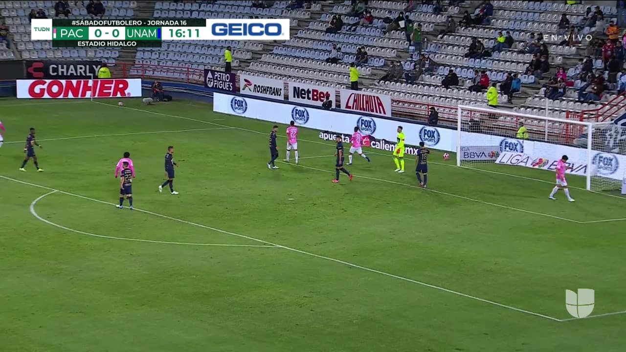 Tiro atajado junto al lado derecho de la portería. Óscar Murillo (Pachuca) disparo de cabeza desde el centro del área. Asistencia de Víctor Guzmán con un centro al área.