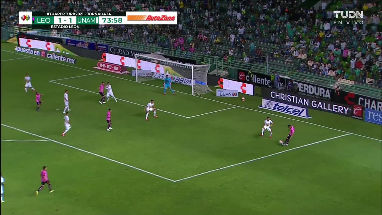 Tiro atajado raso al centro del arco. Osvaldo Rodríguez (León) disparo de cabeza desde el lado izquierdo dentro del área. Asistencia de Ángel Mena con un centro al área.