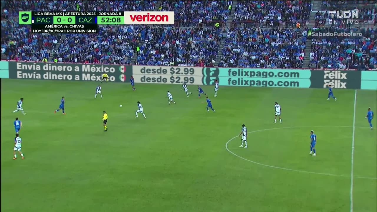 Tiro atajado por abajo a la izquierda. Oussama Idrissi (Pachuca) zurdazo a quemarropa desde el lado izquierdo.
