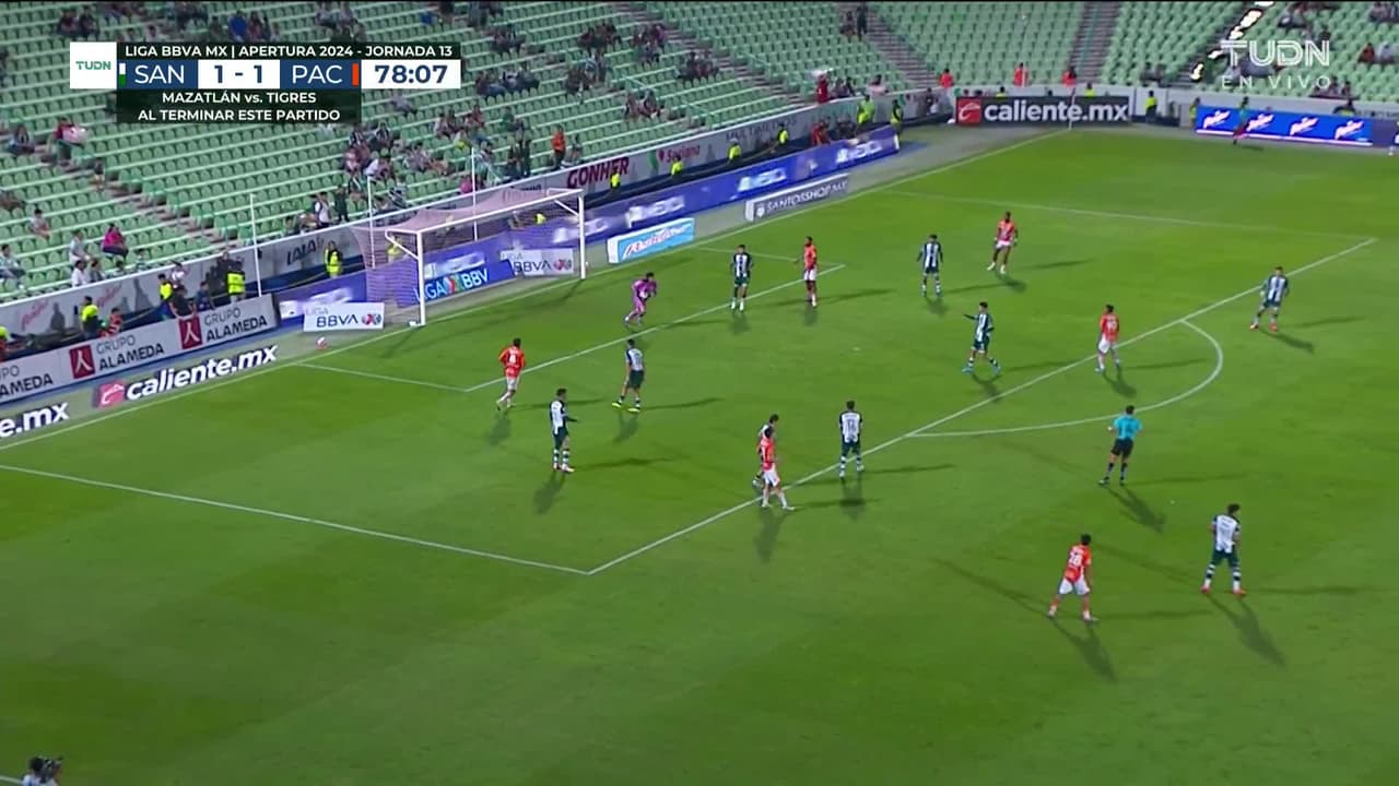 Tiro atajado. Oussama Idrissi (Pachuca) Disparo con la derecha desde el lado izquierdo dentro del área.