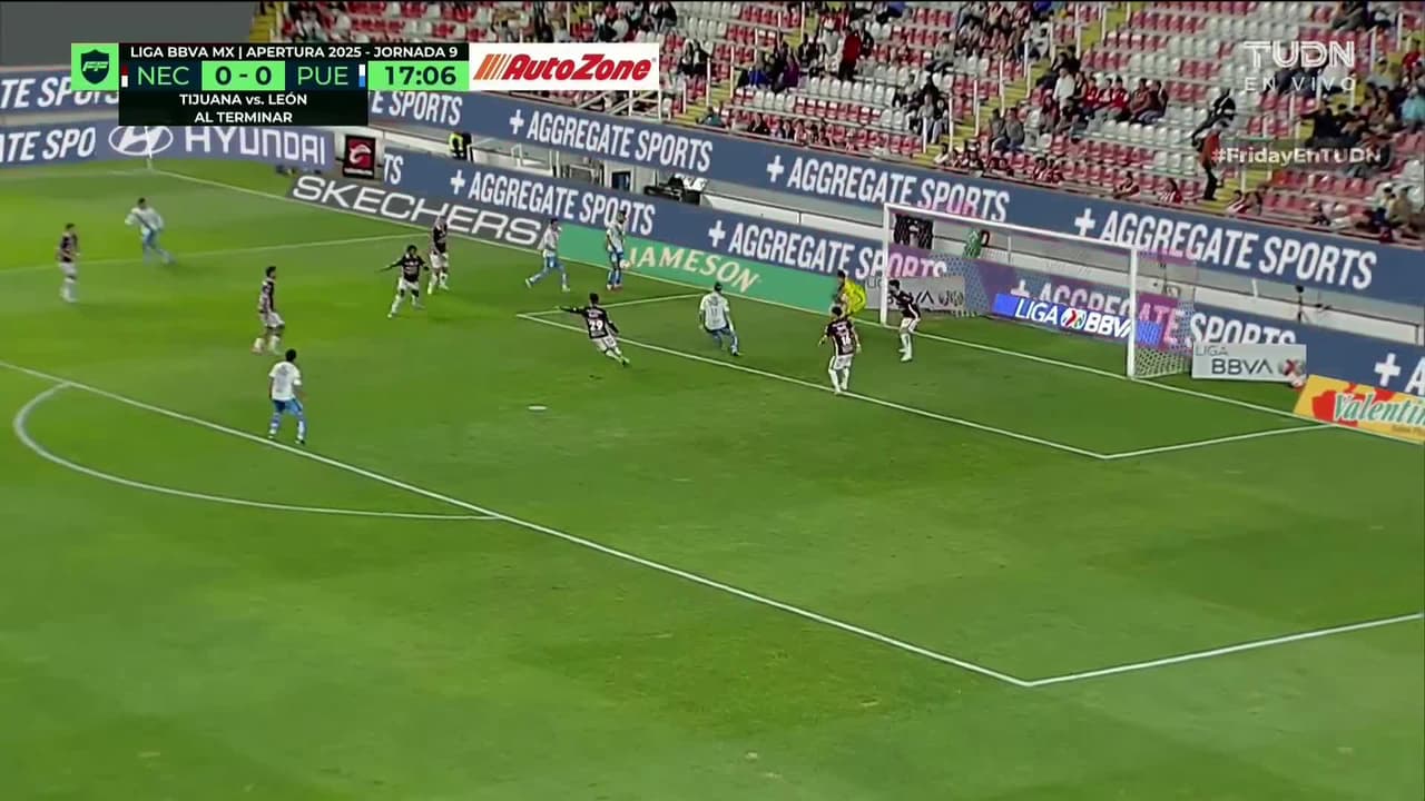 Tiro atajado raso al centro del arco. Owen González (Puebla) Disparo con la derecha desde el lado izquierdo dentro del área.