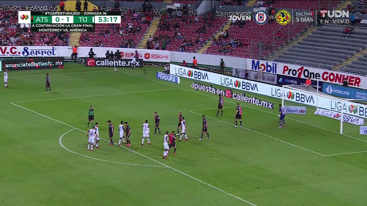 Tiro atajado junto al lado derecho de la portería. Ozziel Herrera (Atlas) zurdazo desde fuera del área. Asistencia de Jeremy Márquez pase largo.