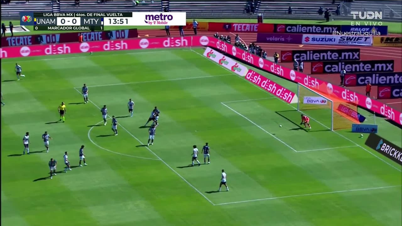 Tiro atajado junto al lado derecho de la portería. Pablo Bennevendo (Pumas UNAM) zurdazo desde más de 30 metros.