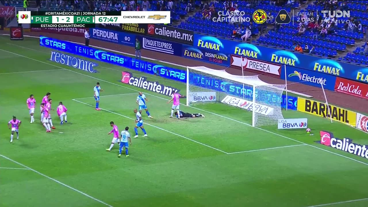 Remate parado bajo palos a rás de suelo. Pablo Parra (Puebla) remate con la derecha desde fuera del área.