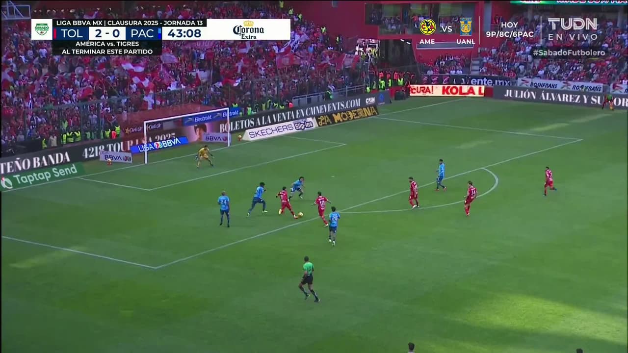 Tiro atajado raso al centro del arco. Paulinho (Toluca) Disparo con la derecha desde el centro del área. Asistencia de Alexis Vega.