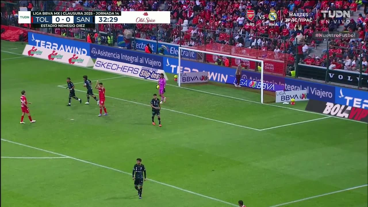 Tiro atajado raso al centro del arco. Paulinho (Toluca) disparo de cabeza desde el centro del área. Asistencia de Alexis Vega.