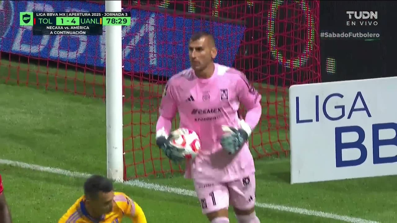 Tiro atajado. Paulinho (Toluca) disparo de cabeza desde el centro del área.