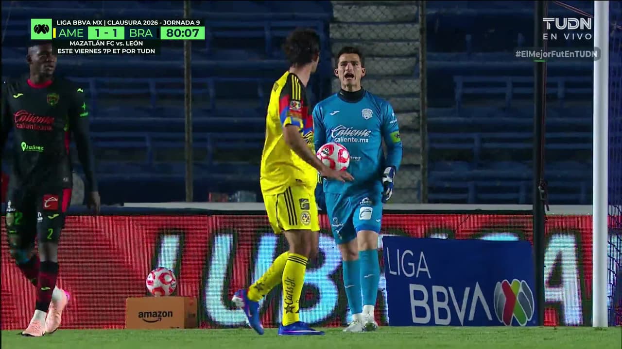 Tiro atajado raso al centro del arco. Raphael Veiga (América) zurdazo desde fuera del área. Asistencia de Aarón Mejía.