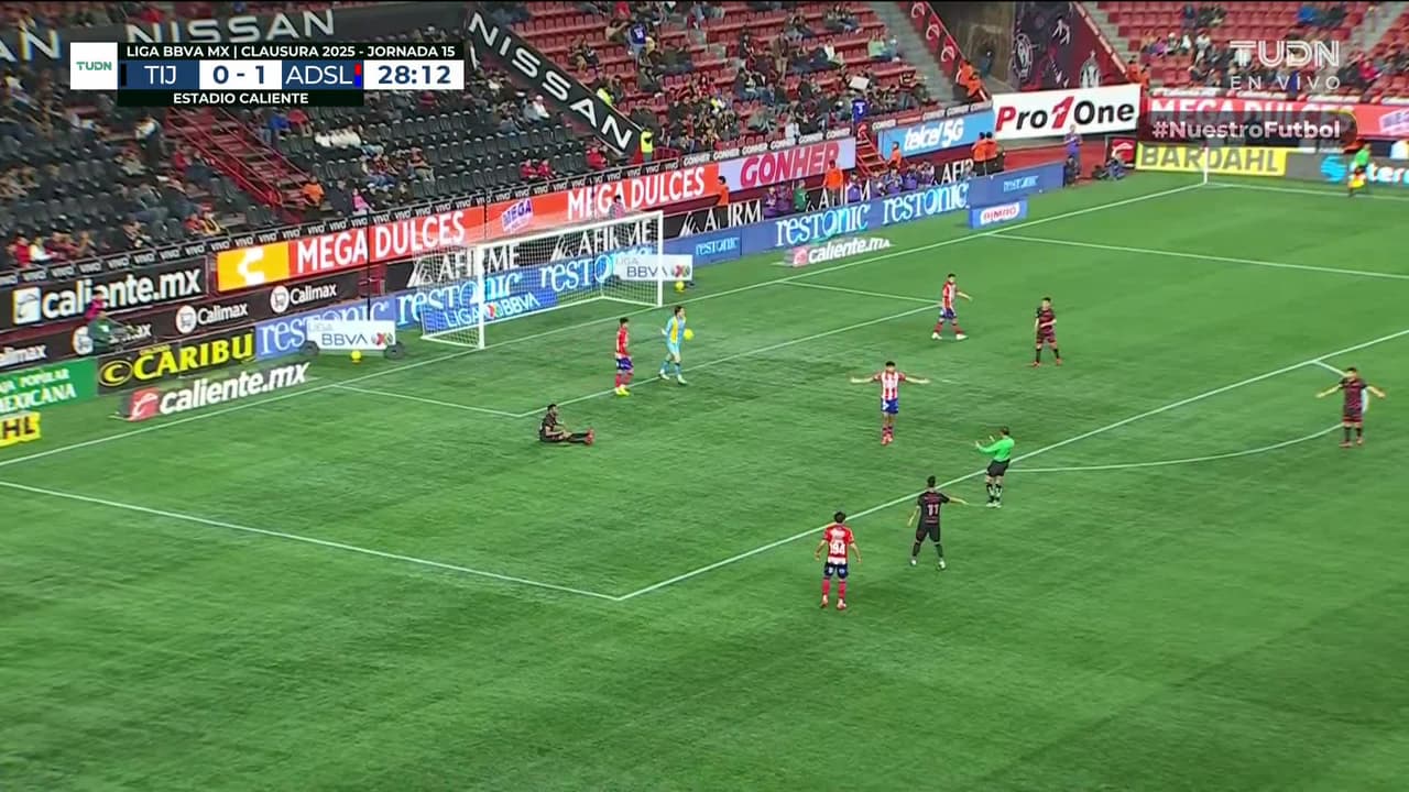 Tiro atajado. Raúl Zúñiga (Club Tijuana) Disparo con la derecha desde el centro del área.