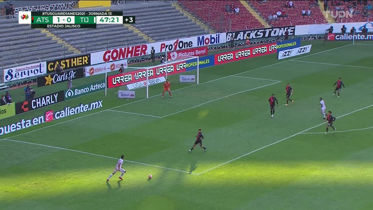 Tiro atajado junto al lado derecho de la portería. Renato Ibarra (Atlas) zurdazo desde fuera del área.