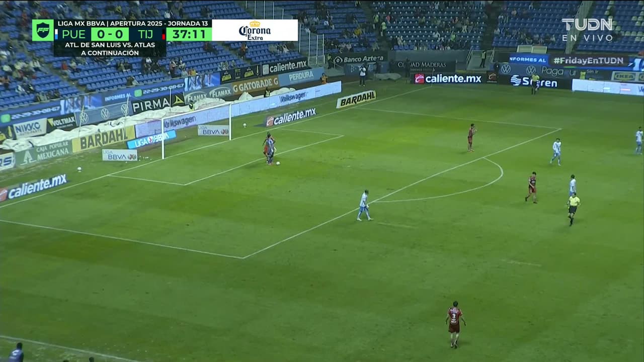 Tiro atajado. Ricardo Marín (Puebla) zurdazo desde fuera del área.