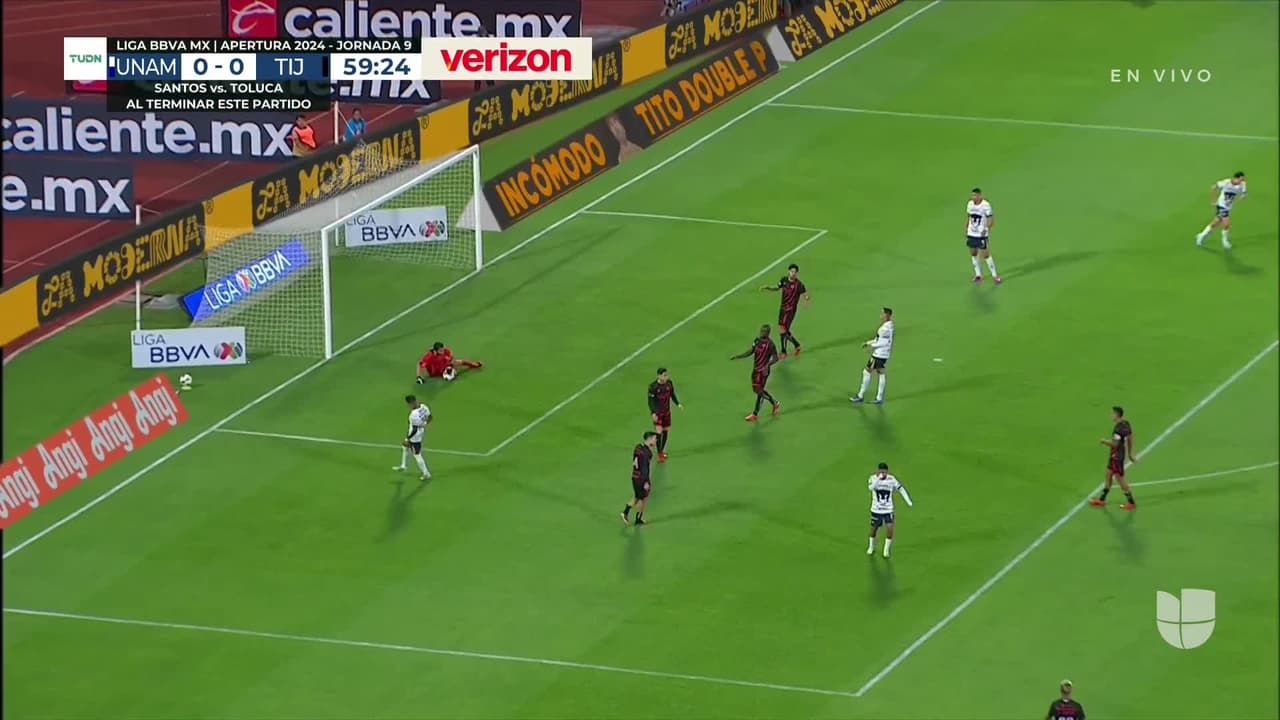 Tiro atajado por abajo a la izquierda. Robert Ergas (Pumas UNAM) Disparo con la derecha desde el lado izquierdo dentro del área.