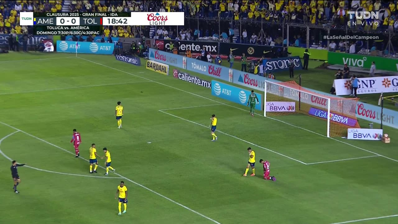 Tiro atajado. Robert Morales (Toluca) Disparo con la derecha desde el lado derecho dentro del área.