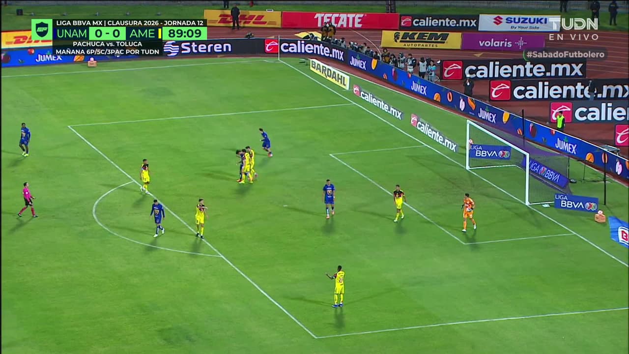 Tiro atajado junto al lado derecho de la portería. Robert Morales (Pumas UNAM) disparo de cabeza desde el centro del área. Asistencia de Rodrigo López con un centro al área.