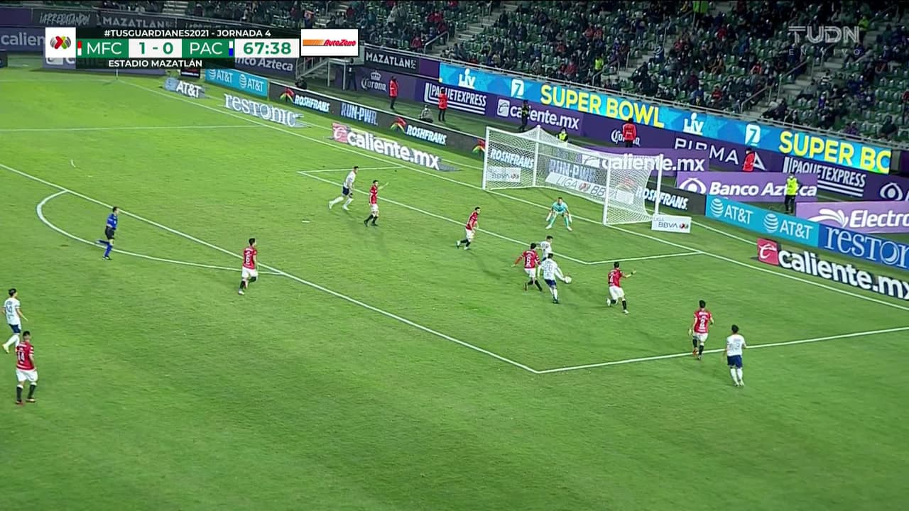 Tiro atajado junto al lado derecho de la portería. Roberto de la Rosa (Pachuca) Disparo con la derecha desde el lado derecho dentro del área. Asistencia de Erick Sánchez.