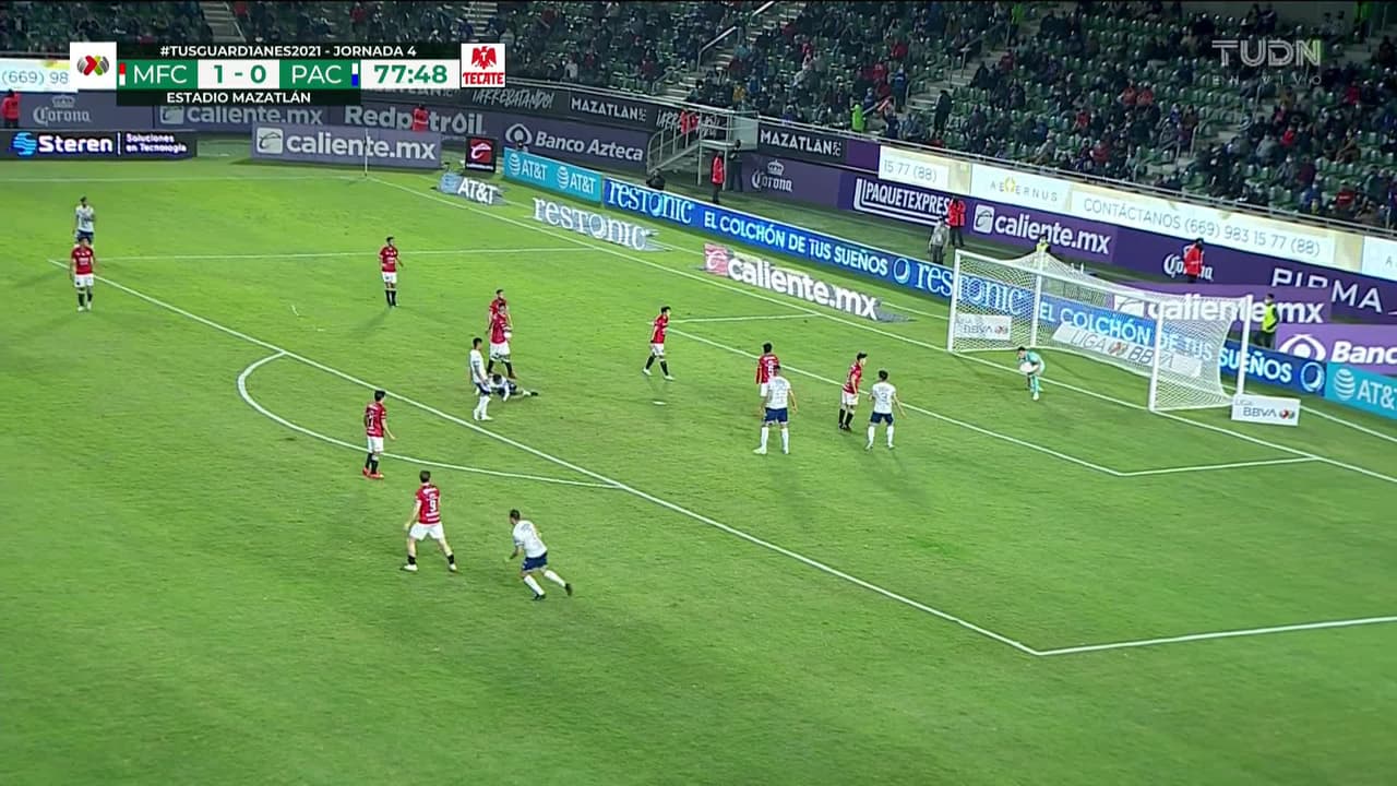 Tiro atajado. Roberto de la Rosa (Pachuca) disparo de cabeza desde el centro del área.