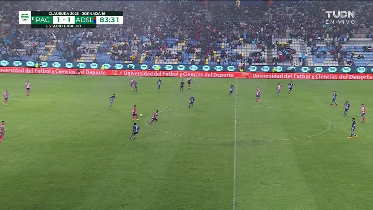 Tiro atajado. Roberto de La Rosa (Pachuca) Disparo con la derecha desde fuera del área.