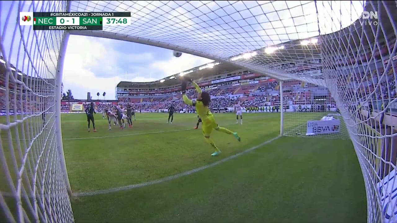 Tiro atajado al ángulo superior derecho. Rodrigo Aguirre (Necaxa) disparo de cabeza desde el centro del área.