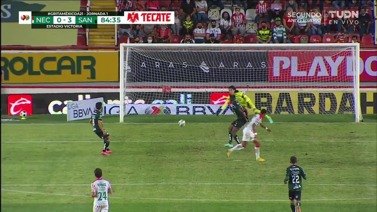 Tiro atajado por abajo a la izquierda. Rodrigo Aguirre (Necaxa) disparo de cabeza desde el centro del área. Asistencia de Luis Garcia con un centro al área.