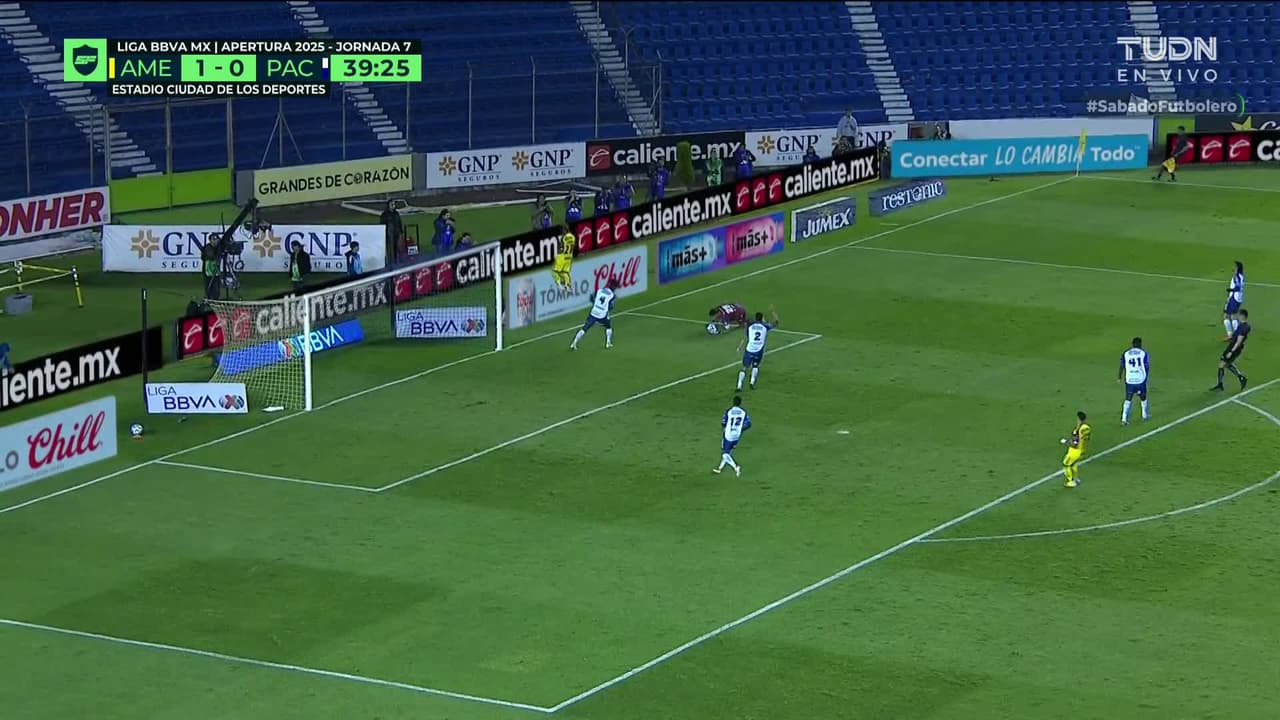 Tiro atajado. Rodrigo Aguirre (América) Disparo con la derecha desde el lado derecho dentro del área.