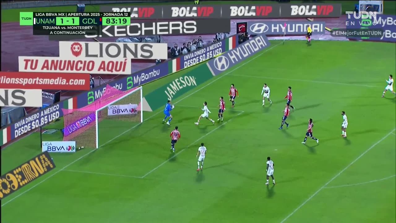 Tiro atajado al ángulo superior derecho. Rodrigo López (Pumas UNAM) Disparo con la derecha desde el lado derecho dentro del área.