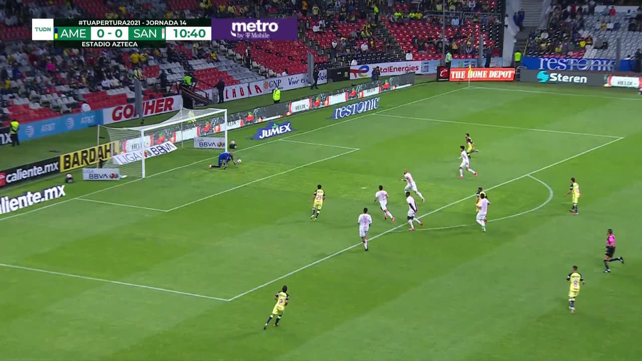 Tiro atajado. Roger Martínez (América) Disparo con la derecha desde fuera del área.