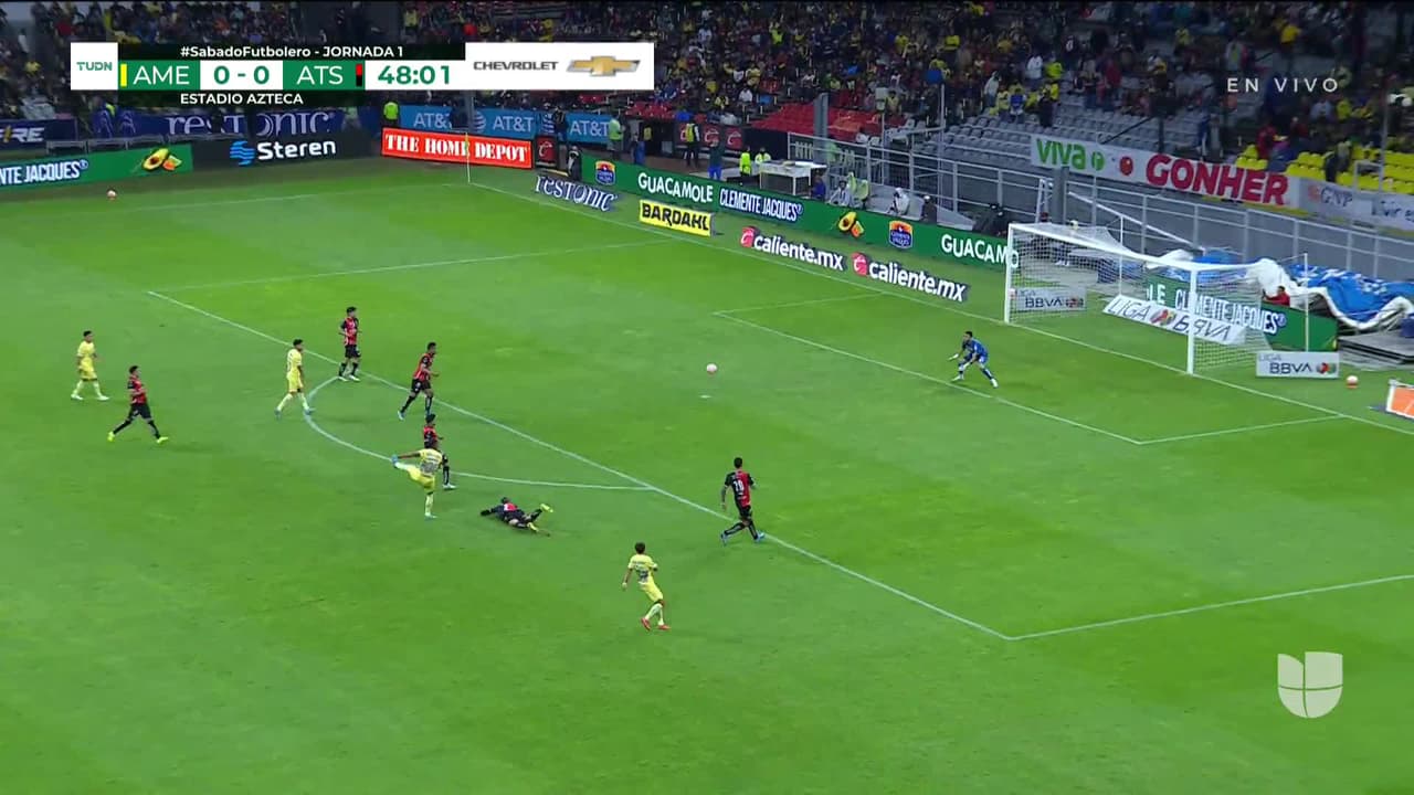 Tiro atajado raso al centro del arco. Román Martínez (América) Disparo con la derecha desde fuera del área.