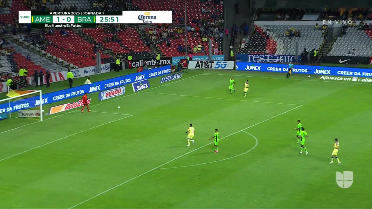 Tiro atajado raso al centro del arco. Román Martínez (América) disparo de cabeza desde el centro del área. Asistencia de Miguel Layún con un centro al área.