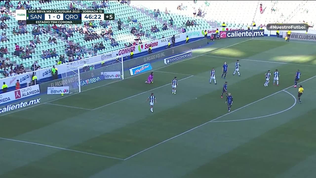 Tiro atajado raso al centro del arco. Ronaldo Cisneros (Querétaro) zurdazo desde el lado derecho dentro del área.
