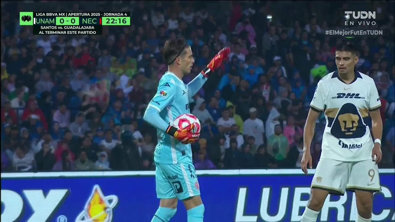 Tiro atajado raso al centro del arco. Rubén Duarte (Pumas UNAM) Disparo con la derecha desde el centro del área.