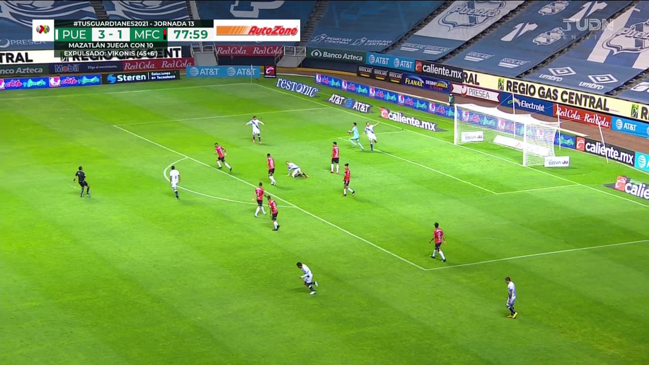 Tiro atajado por abajo a la izquierda. Santiago Ormeño (Puebla) disparo de cabeza desde el centro del área. Asistencia de George Corral con un centro al área.