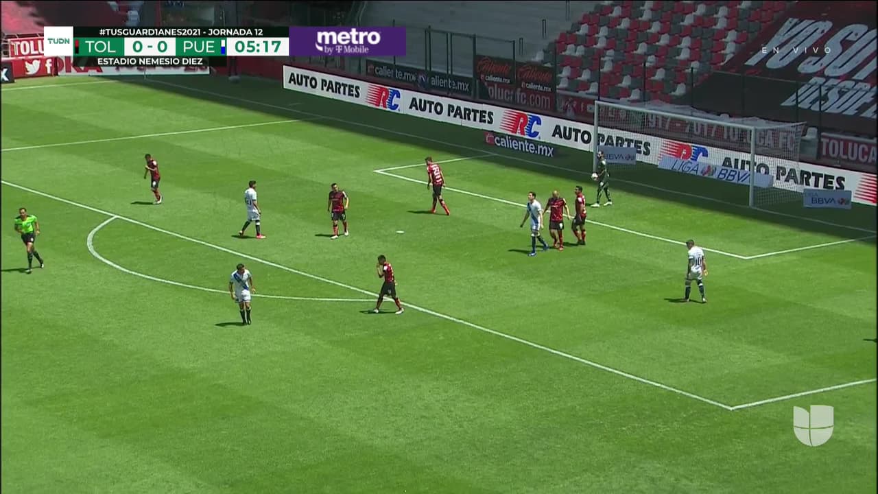 Tiro atajado Por arriba en el centro del arco. Santiago Ormeño (Puebla) disparo de cabeza desde el centro del área. Asistencia de Salvador Reyes con un centro al área.