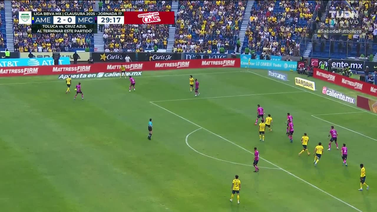 Tiro atajado. Sebastián Cáceres (América) disparo de cabeza desde el centro del área.