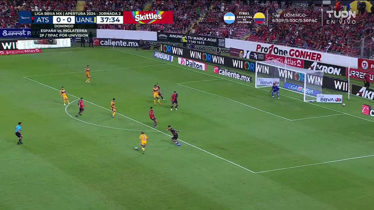 Tiro atajado. Sebastián Córdova (Tigres) zurdazo desde fuera del área.