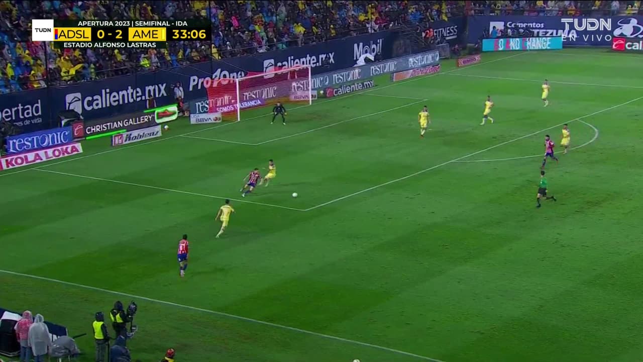 Tiro atajado por abajo a la izquierda. Sébastien Salles-Lamonge (Atlético San Luis) Disparo con la derecha desde fuera del área. Asistencia de Juan Manuel Sanabria con un pase de cabeza.