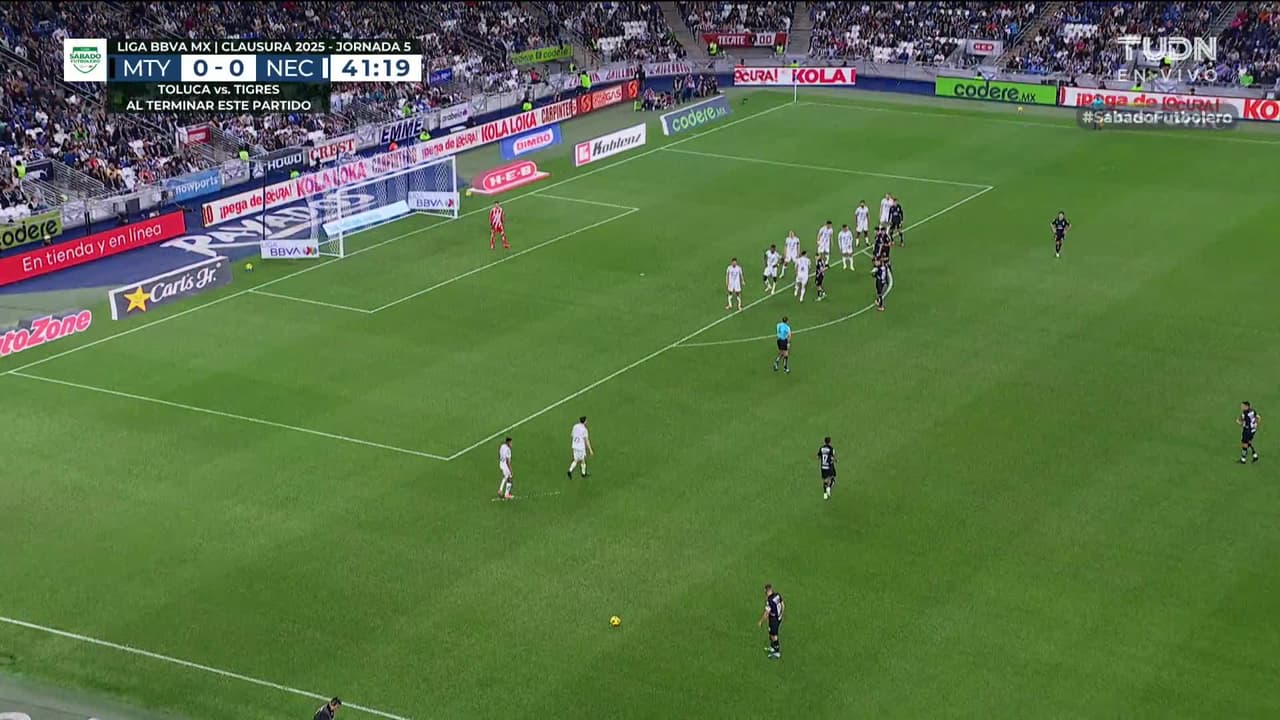 Tiro atajado. Sergio Canales (Monterrey) zurdazo desde la banda izquierda.