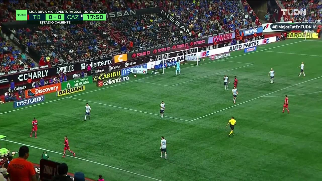 Tiro atajado. Shamar Nicholson (Club Tijuana) Disparo con la derecha desde el centro del área.