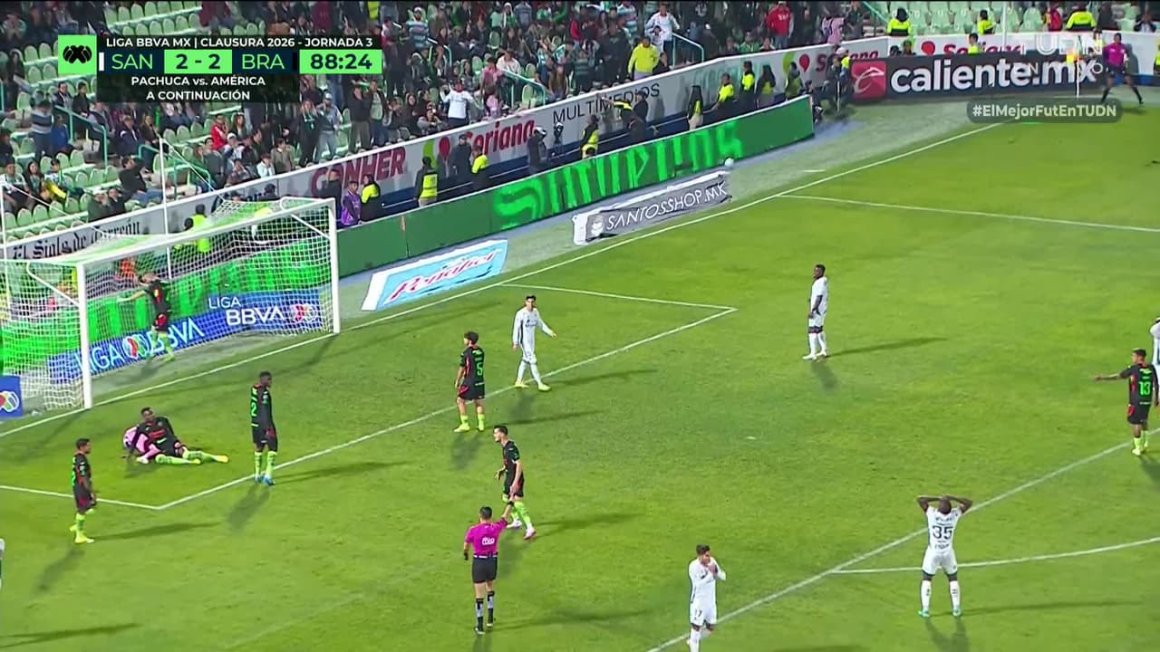 Tiro atajado raso al centro del arco. Tahiel Jiménez (Santos Laguna) zurdazo desde el centro del área. Asistencia de Emmanuel Echeverría con un centro al área.