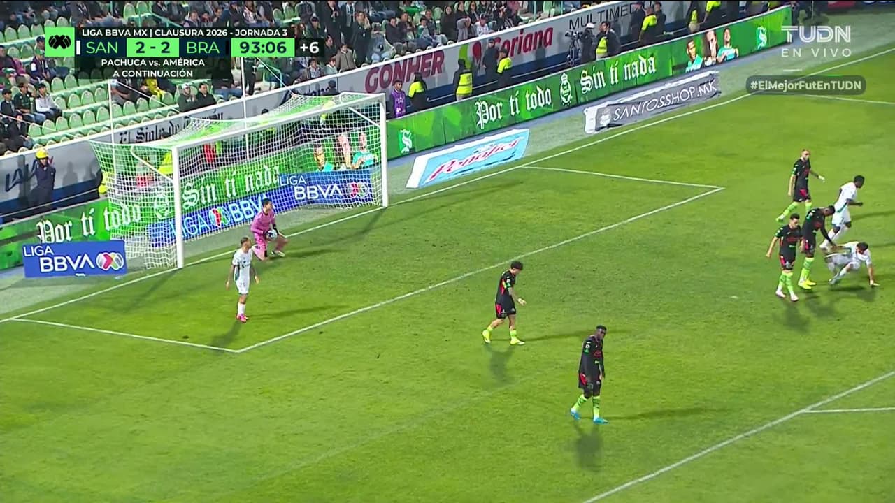 Tiro atajado. Tahiel Jiménez (Santos Laguna) disparo de cabeza desde el centro del área.
