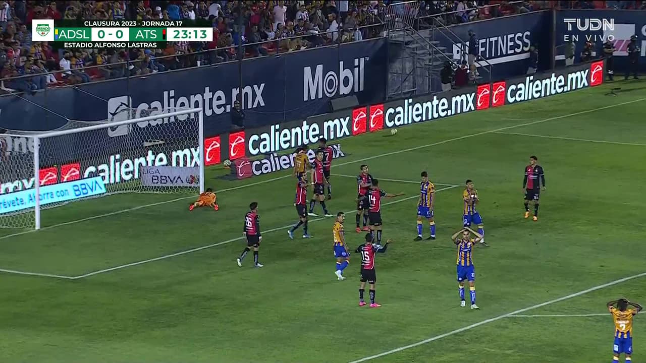 Tiro atajado junto al lado derecho de la portería. Unai Bilbao (Atlético San Luis) disparo de cabeza desde el centro del área.