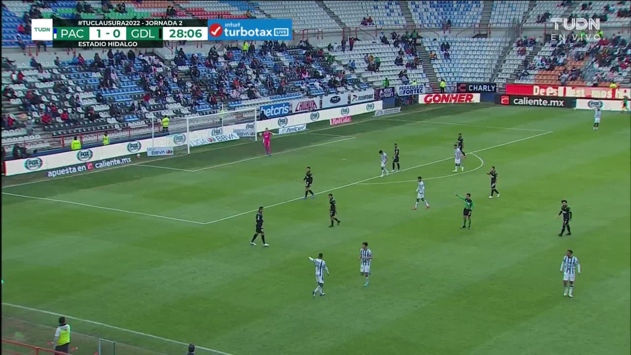Tiro atajado junto al lado derecho de la portería. Víctor Guzmán (Pachuca) Disparo con la derecha desde el lado derecho dentro del área.