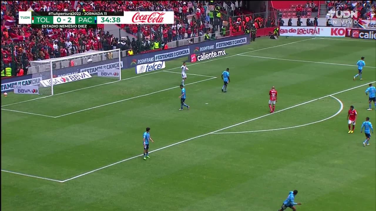 Tiro atajado. Valber Huerta (Toluca) zurdazo desde fuera del área.